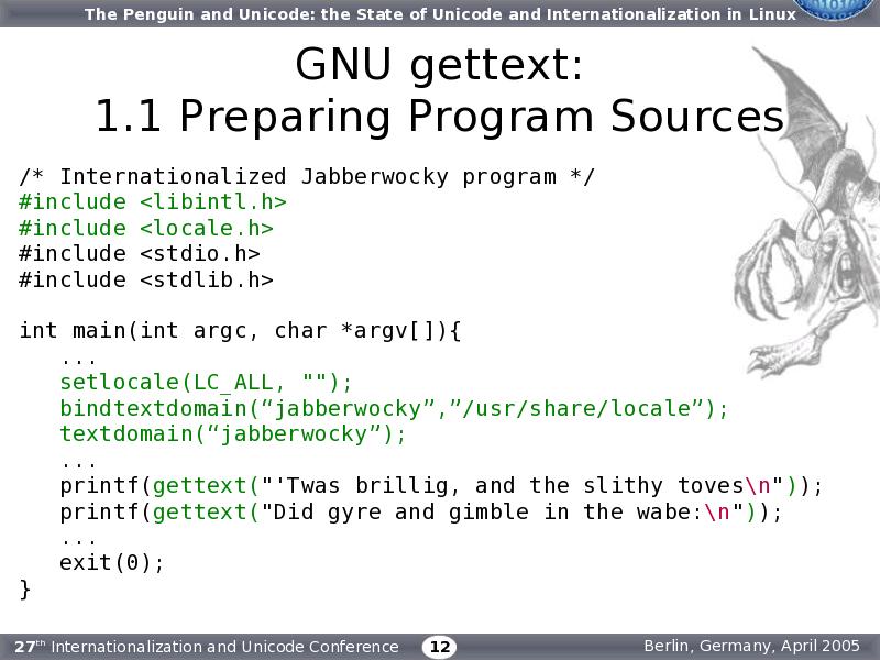 the “libintl” and “locale” headers. In main(), add the calls to setlocale(), bindtextdomain(), and textdomain(). Bindtextdomain() tells the library to look for localized message catalogs for the “jabbberwocky” program in the “/usr/share/locale” directory. textdomain() sets the text domain. After that, all that is required is to wrap all translatable strings with calls to gettext().