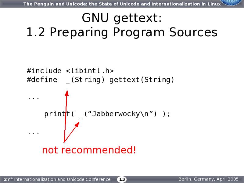 The GNU gettext manual mentions that some GNU packages use a simple “_” underscore internally, so you might see ' _(“Jabberwocky”)' instead of ' gettext(“Jabberwocky”)'. I would not recommend this practice to anyone writing new programs, since it may be unclear to readers of the code what the “_“ underscore is supposed to mean, and code clarity is an imperative in any well-written program.