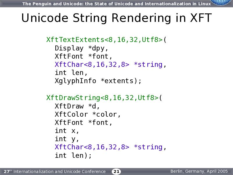 For many projects on Linux, the de facto standard is to use UTF-8. Linux is based on Unix which has historically used byte-based data streams. The design and subsequent use of UTF-8 on Unix allowed many Unix utilities to handle Unicode data streams with minimal changes to the existing byte-oriented code. UTF-8 continues to be the preferred Unicode transformation format on Linux today for numerous reasons1 which tend to simplify things for the Linux programmer. Thus, many projects on Linux make use of XftDrawStringUtf8() which accepts an ordinary ANSI C string containing UTF-8 text. However, if you need to, you can use XftDrawString16() to process UTF-16 strings, or XftDrawString32() to processs UCS-4 strings.