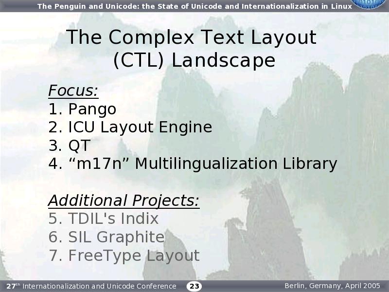 On Apple OS X, there is ATSUI1. On Windows, there is Uniscribe2. End of story! But on Linux, it is quite a different story! On Linux, there are: (1) Owen Taylor's Pango library, (2) Eric Mader's Layout Engine in IBM's International Components for Unicode (ICU), (3) Trolltech's QT toolkit, and (4) Japan's National Institute of Advanced Science and Technology's (AIST) “m17n” multilingual layout library. In addition to these four, there are also (5) India's TDIL Indix project3, (6) SIL International's Graphite4 project, and, finally, (7) the still vaporous FreeType Layout5 project.