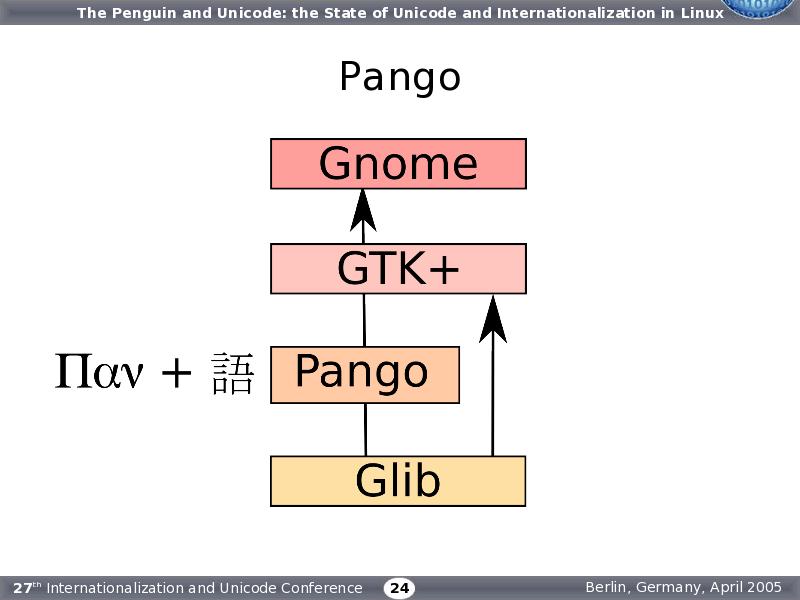 Pango1 is the internationalized text layout library written in C by Owen Taylor for the Gnome project. The name “Pango” derives from the Greek “παν” meaning “all”, and the Japanese “語 ” “go” meaning language. Although Pango is used in the Gnome project, Pango is only dependent on the low-level glib library (part of the GTK+ project). No other GTK+/Gnome libraries are required. Pango can be built with backends to FreeType, X, and Xft. Thus it is fairly easy to use Pango in other projects that are not related to the Gnome desktop. For example, we are currently using Pango as the layout engine for the LASi2 Unicode Postscript printing library in Dr. Richard's lab at the Kellogg Eye Center.