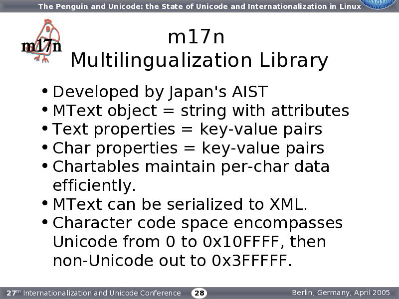 The “m17n”1 Multilingualization library is a project developed by Japan's National Institute of Advanced Industrial Science and Technology (AIST). The library is written in C. The library has many interesting features.