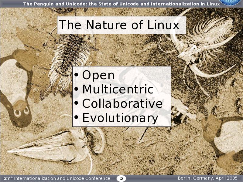 To set the stage for this talk, I'd like to review some aspects of the Open Source development process that impact Linux and the globalization of Linux in significant ways.